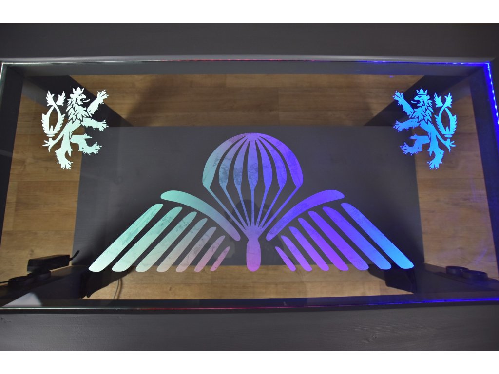 Coffee E-table 3 Colours Army je e-table s českou trikolórou, vojenským motivem 43. výsadkového pluku z Chrudimi a českým lvem po obou stranách. Tento praktický a designový kousek udělá velkou parádu ve vaší domácnosti či kanceláři.